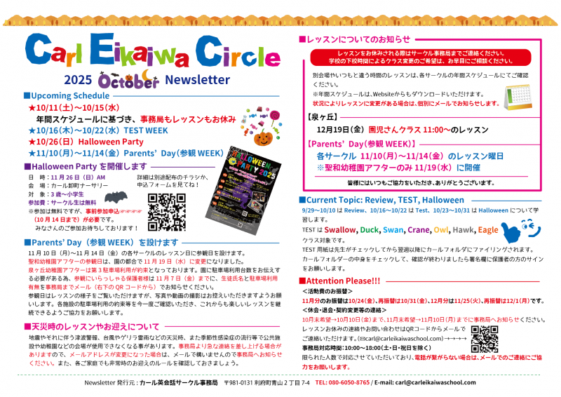 10月11日(土)~10月15日(水)はレッスンも事務局もお休みです。